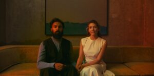 Prospective parents Aaryan (Himesh Patel, left) and Mia (Elizabeth Olsen, right) prepare to undergo a government-sanctioned evaluation to determine if they are suitable candidates to become parents in a world of the future, as seen in director Fleur Fortuné’s debut feature, “The Assessment,” available for streaming online. Photo by Magnus Jønck, courtesy of Magnolia Pictures.