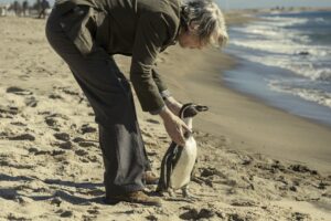 After caring for an oil-clad penguin (Baba/Richard, right) stranded on a beach, English teacher Tom Michell (Steve Coogan, left) unsuccessfully tries returning him to the wild in director Peter Cattaneo’s new comedy-drama, “The Penguin Lessons,” now available for streaming online. Photo by Andrea Resmini, courtesy of Sony Pictures Classics.
