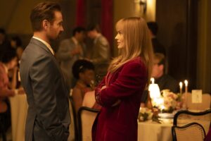 Once at the wedding, David – a longtime bachelor – finds himself surrounded by happy couples. It gives him some pause to compare his situation to theirs, but he’s not apparently upset being at the festivities solo, as it’s something to which he’s seemingly grown accustomed. That changes, however, when he’s introduced to another single, Sarah (Margot Robbie). They share a brief, somewhat tentative flirtation, though it ultimately seems that they’re not especially suited to one another, primarily because both of them (especially Sarah) seem perfectly comfortable being intentionally on their own, with no driving desire to find a permanent partner. But does that impression accurately reflect their true feelings? That’s what they’re about to find out.