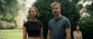 While strolling through the garden of a self-help retreat center, professional “companion” Matthias (Albrecht Schuch, right) and his hoped-for would-be companion, Ina (Theresa Frostad Eggesbø, left), spot a preening peacock, whom she astutely characterizes as the epitome of unbridled pretention, as seen in writer-director Bernhard Wenger’s debut feature, “Peacock” (“Pfau – Bin ich echt?”). Photo © NGF Geyrhalterfilm-CALA Film-Albin Wildner, courtesy of Oscilloscope Laboratories.