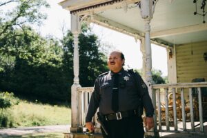Bumbling police officer Casey (Stavros Halkias) clumsily investigates the mysterious disappearance of a CEO in the darkly satirical new comedy-drama-sci fi fantasy, “Bugonia,” from director Yorgos Lanthimos, now playing theatrically. Photo © by Atsushi Nishijima/Focus Features, courtesy of Focus Features.