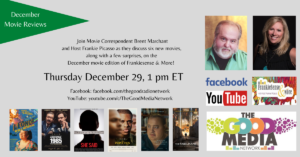 Join Good Media Network Movie Correspondent Brent Marchant and show host Frankie Picasso for six new movie reviews on the next edition of the Frankiesense & More video podcast! The show, to begin airing at a special day and time, Thursday December 29 at 1 pm ET, will also feature a few additional special announcements. Tune in on Facebook or YouTube for all the fun and lively discussion!