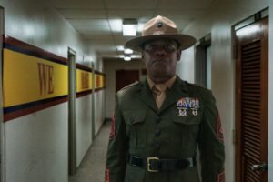 As Ellis steps off the bus that takes him to boot camp, his life changes in an instant. His initial indoctrination into his new world is characterized by rigidity, harsh discipline and intimidation. His drill instructor, Sgt. Laws (Bokeem Woodbine), barks orders and questions at him upon his arrival, including asking him whether or not he had ever been a homosexual. Laws is innately skeptical about Ellis’s negative reply, slyly responding with a sinister smirk and stating definitively that he will break the new recruit. (Of course, as a Marine drill instructor, that’s his primary goal when it comes to training all newcomers, a tactic intended as a means to help build them back up, but one that could prove particularly challenging for someone like Ellis, given his character and sensibilities – and Laws’s apparent intent to be particularly hard on him.)